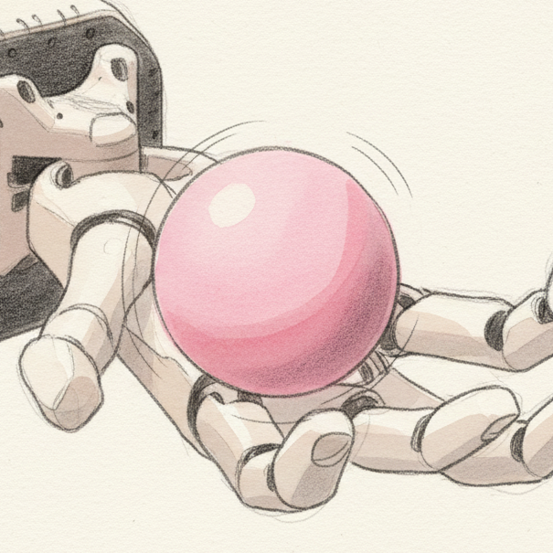 The agent's observation encoder is trained only with RL losses. Across 5 seeds, the mean and maximum performance was 69 and 77 bounces. The agent plays it safe, keeping the ball secure between the index and pinky finger.